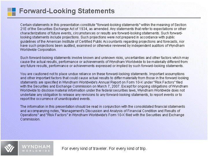 | Forward-Looking Statements Certain statements in this presentation constitute "forward-looking statements" within the meaning of Section 21E of the Securities Exchange Act of 1934, as amended. Any statements that refer to expectations or other characterizations of future events, circumstances or results are forward-looking statements. Such forward- looking statements include projections. Such projections were not prepared in accordance with public guidelines of the American Institute of Certified Public Accountants regarding projections and forecasts, nor have such projections been audited, examined or otherwise reviewed by independent auditors of Wyndham Worldwide Corporation. Such forward-looking statements involve known and unknown risks, uncertainties and other factors which may cause the actual results, performance or achievements of Wyndham Worldwide to be materially different from any future results, performance or achievements expressed or implied by such forward-looking statements. You are cautioned not to place undue reliance on these forward-looking statements. Important assumptions and other important factors that could cause actual results to differ materially from those in the forward looking statements are specified in Wyndham Worldwide's Annual Report on Form 10-K under "Risk Factors" filed with the Securities and Exchange Commission on March 7, 2007. Except for ongoing obligations of Wyndham Worldwide to disclose material information under the federal securities laws, Wyndham Worldwide does not undertake any obligation to release any revisions to any forward-looking statements, to report events or to report the occurrence of unanticipated events. The information in this presentation should be read in conjunction with the consolidated financial statements and accompanying notes, "Management's Discussion and Analysis of Financial Condition and Results of Operations" and "Risk Factors" in Wyndham Worldwide's Form 10-K filed with the Securities and Exchange Commission. |