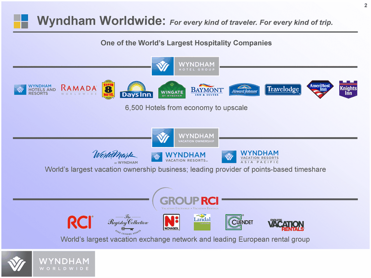 | Wyndham Worldwide: For every kind of traveler. For every kind of trip. 6,500 Hotels from economy to upscale One of the World's Largest Hospitality Companies World's largest vacation ownership business; leading provider of points-based timeshare World's largest vacation exchange network and leading European rental group |