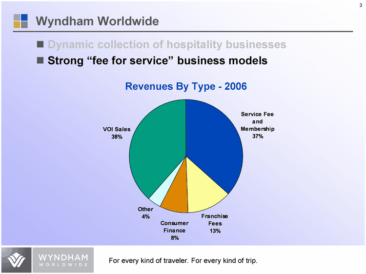 | Dynamic collection of hospitality businesses Strong "fee for service" business models VOI Sales Service Fee and Membership Franchise Fees Consumer Finance Other 0.389771986970684 0.37 0.13 0.08 0.04 Revenues By Type - 2006 Wyndham Worldwide |