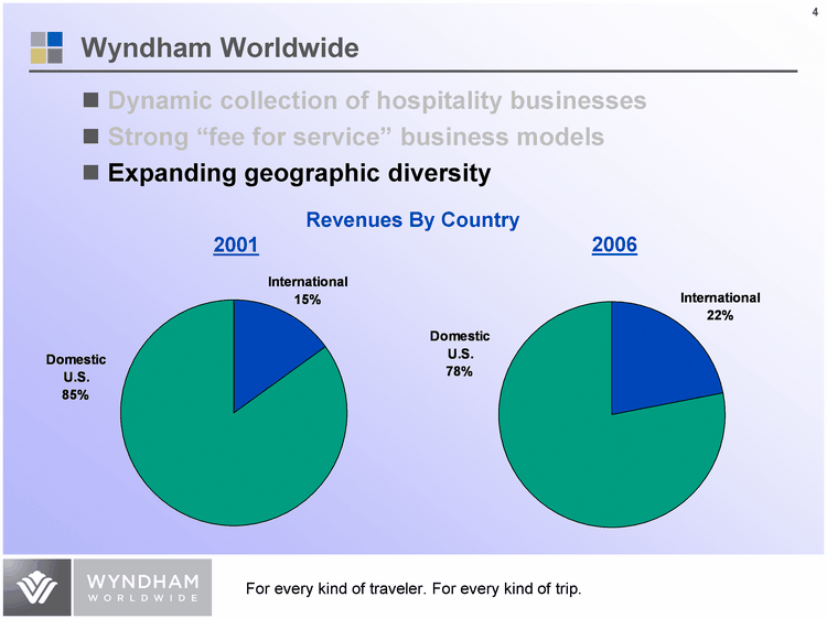 | Dynamic collection of hospitality businesses Strong "fee for service" business models Expanding geographic diversity Domestic U.S. International 0.78 0.22 2006 Wyndham Worldwide Domestic U.S. International 0.85 0.15 2001 Revenues By Country |