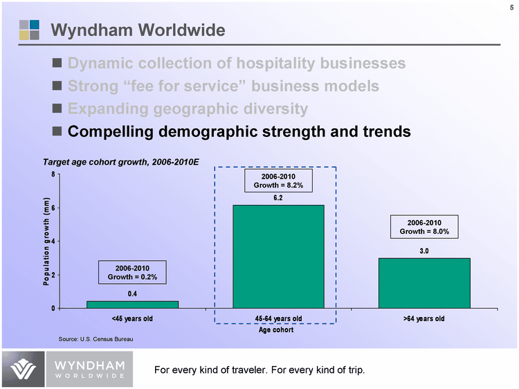 | Dynamic collection of hospitality businesses Strong "fee for service" business models Expanding geographic diversity Compelling demographic strength and trends Column 1 <45 years old 0.41 45-64 years old 6.15 >64 years old 2.98 >4% 0.015 Source: U.S. Census Bureau 2006-2010 Growth = 0.2% 2006-2010 Growth = 8.2% 2006-2010 Growth = 8.0% Target age cohort growth, 2006-2010E Wyndham Worldwide |