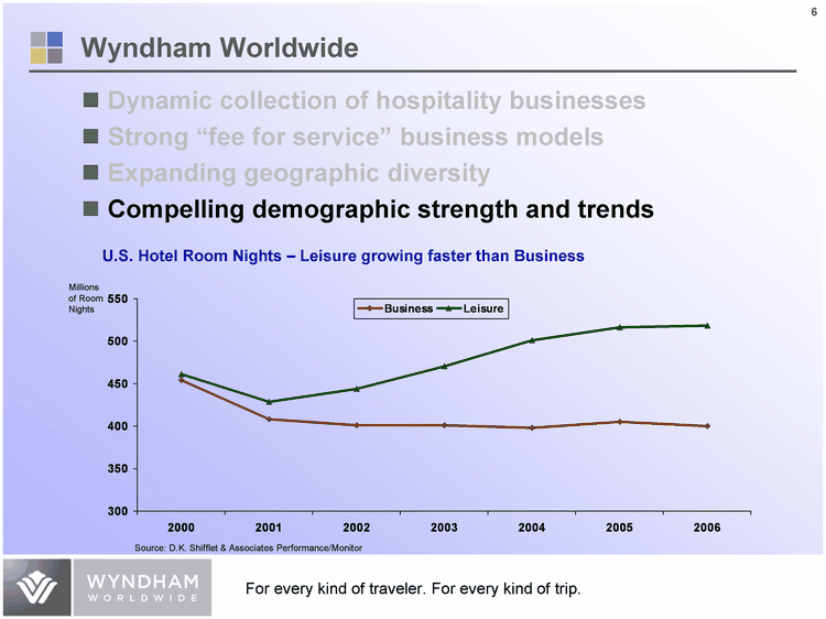 | Dynamic collection of hospitality businesses Strong "fee for service" business models Expanding geographic diversity Compelling demographic strength and trends Wyndham Worldwide Business Leisure 2000 454 461 2001 408 429 2002 401 444 2003 401 470 2004 398 501 2005 405 516 2006 400 518 U.S. Hotel Room Nights - Leisure growing faster than Business Source: D.K. Shifflet & Associates Performance/Monitor Millions of Room Nights |