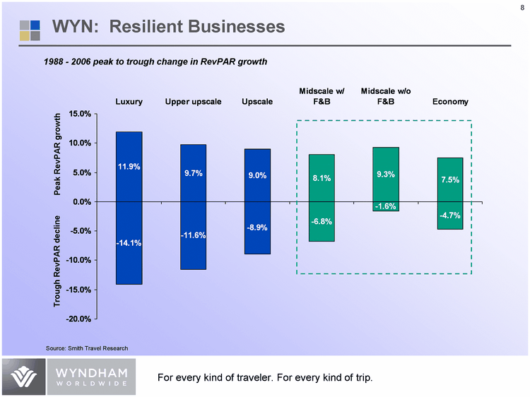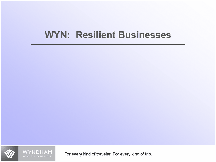 | Luxury Upper upscale Upscale Midscale w/ F&B Midscale w/o F&B Economy High 0.119 0.097 0.09 0.081 0.093 0.075 Low -0.141 -0.116 -0.089 -0.068 -0.016 -0.047 Trough RevPAR decline Peak RevPAR growth 1988 - 2006 peak to trough change in RevPAR growth Source: Smith Travel Research WYN: Resilient Businesses |