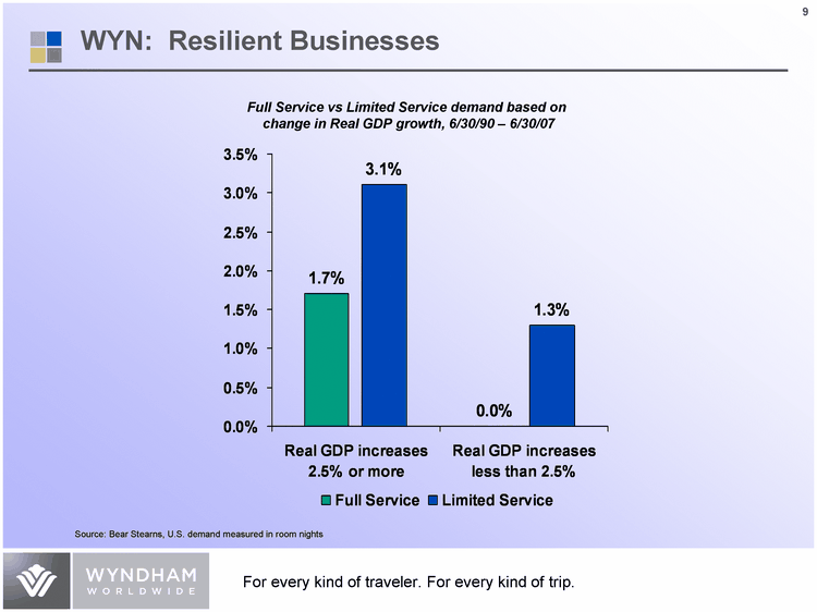 | Full Service Limited Service Real GDP increases 2.5% or more 0.017 0.031 Real GDP increases less than 2.5% 0 0.013 Above 75K 0.036 Full Service vs Limited Service demand based on change in Real GDP growth, 6/30/90 - 6/30/07 Source: Bear Stearns, U.S. demand measured in room nights WYN: Resilient Businesses |