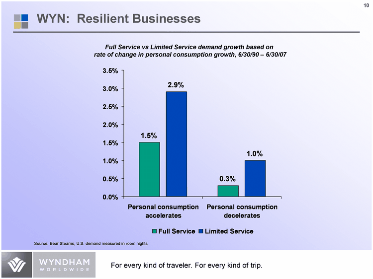 | Full Service Limited Service Personal consumption accelerates 0.015 0.029 Personal consumption decelerates 0.003 0.01 Above 75K 0.036 Full Service vs Limited Service demand growth based on rate of change in personal consumption growth, 6/30/90 - 6/30/07 WYN: Resilient Businesses Source: Bear Stearns, U.S. demand measured in room nights |