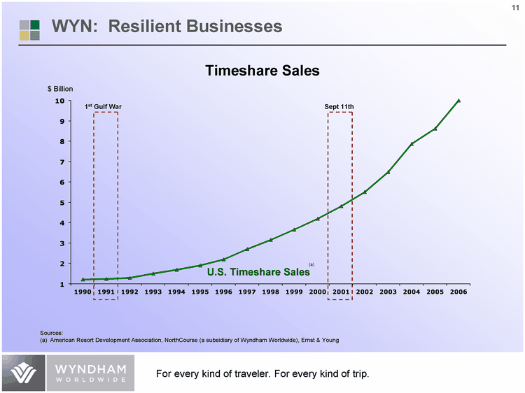 | New Housing Starts U.S. Timeshare Sales 1990 0.8948 1.2 1991 0.8404 1.25 1992 1.0299 1.3 1993 1.1257 1.5 1994 1.1984 1.7 1995 1.0762 1.9 1996 1.1609 2.2 1997 1.1337 2.7 1998 1.2714 3.15 1999 1.3024 3.65 2000 1.2309 4.2 2001 1.2733 4.8 2002 1.3586 5.5 2003 1.499 6.48 2004 1.6105 7.87 2005 1.7158 8.61 2006 1.4654 10 Timeshare Sales Sources: (a) American Resort Development Association, NorthCourse (a subsidiary of Wyndham Worldwide), Ernst & Young Sept 11th 1st Gulf War (a) U.S. Timeshare Sales $ Billion WYN: Resilient Businesses |