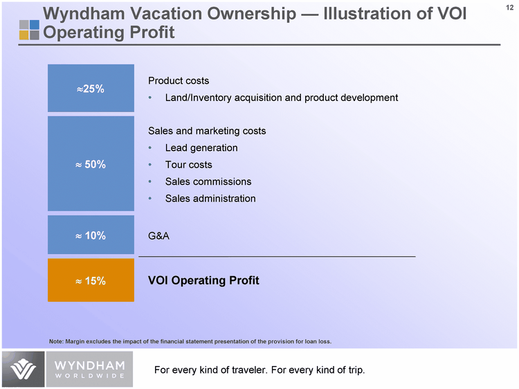 | Wyndham Vacation Ownership - Illustration of VOI Operating Profit ? 10% ?25% ? 50% G&A Product costs Land/Inventory acquisition and product development Sales and marketing costs Lead generation Tour costs Sales commissions Sales administration ? 15% VOI Operating Profit Note: Margin excludes the impact of the financial statement presentation of the provision for loan loss. |