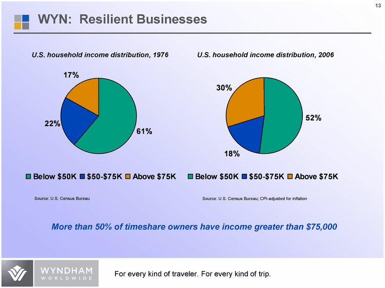 | Below $50K $50-$75K Above $75K 0.61 0.22 0.17 U.S. household income distribution, 1976 Below $50K $50-$75K Above $75K 0.52 0.18 0.3 U.S. household income distribution, 2006 More than 50% of timeshare owners have income greater than $75,000 Source: U.S. Census Bureau Source: U.S. Census Bureau; CPI-adjusted for inflation WYN: Resilient Businesses |