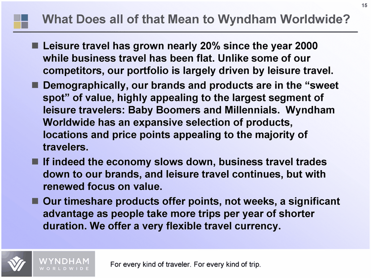 | What Does all of that Mean to Wyndham Worldwide? Leisure travel has grown nearly 20% since the year 2000 while business travel has been flat. Unlike some of our competitors, our portfolio is largely driven by leisure travel. Demographically, our brands and products are in the "sweet spot" of value, highly appealing to the largest segment of leisure travelers: Baby Boomers and Millennials. Wyndham Worldwide has an expansive selection of products, locations and price points appealing to the majority of travelers. If indeed the economy slows down, business travel trades down to our brands, and leisure travel continues, but with renewed focus on value. Our timeshare products offer points, not weeks, a significant advantage as people take more trips per year of shorter duration. We offer a very flexible travel currency. |