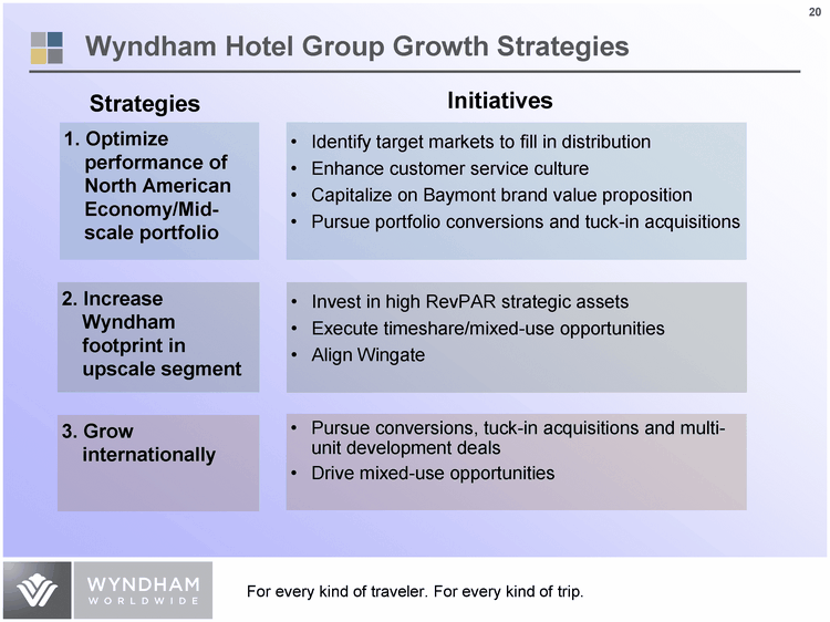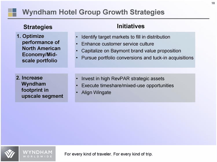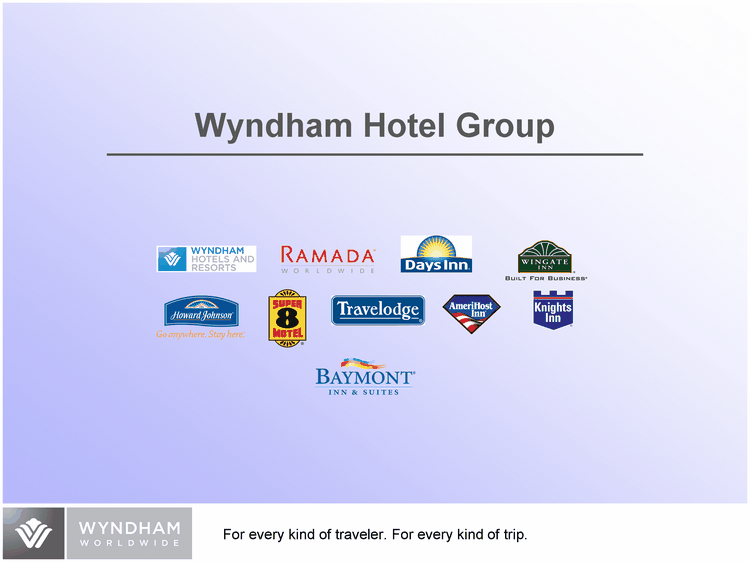 | Wyndham Hotel Group Growth Strategies Strategies Initiatives Identify target markets to fill in distribution Enhance customer service culture Capitalize on Baymont brand value proposition Pursue portfolio conversions and tuck-in acquisitions Invest in high RevPAR strategic assets Execute timeshare/mixed-use opportunities Align Wingate 1. Optimize performance of North American Economy/Mid- scale portfolio 2. Increase Wyndham footprint in upscale segment |