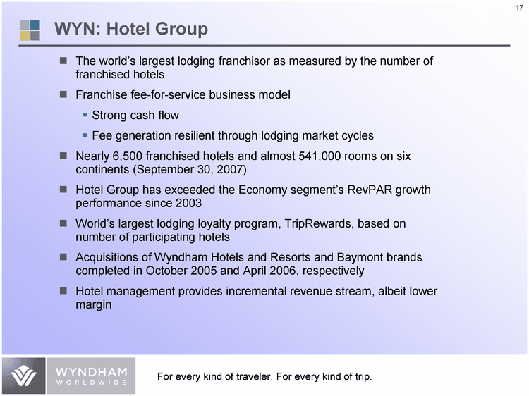 | WYN: Hotel Group The world's largest lodging franchisor as measured by the number of franchised hotels Franchise fee-for-service business model Strong cash flow Fee generation resilient through lodging market cycles Nearly 6,500 franchised hotels and almost 541,000 rooms on six continents (September 30, 2007) Hotel Group has exceeded the Economy segment's RevPAR growth performance since 2003 World's largest lodging loyalty program, TripRewards, based on number of participating hotels Acquisitions of Wyndham Hotels and Resorts and Baymont brands completed in October 2005 and April 2006, respectively Hotel management provides incremental revenue stream, albeit lower margin |
