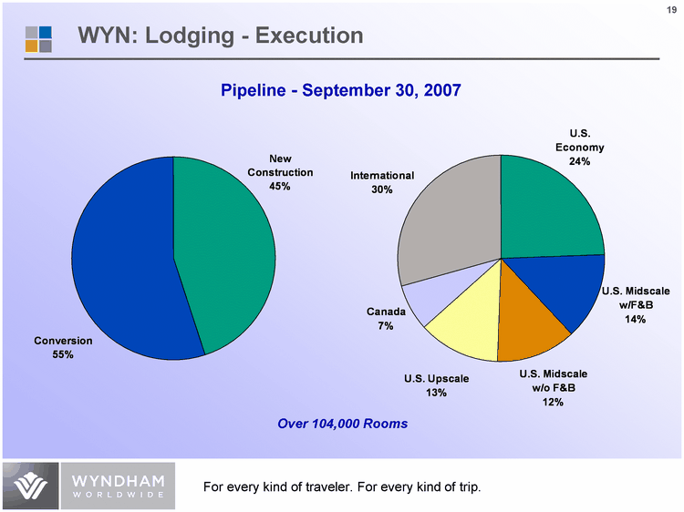 | WYN: Lodging - Execution New Construction Conversion 0.45 0.55 Pipeline - September 30, 2007 Over 104,000 Rooms U.S. Economy U.S. Midscale w/F&B U.S. Midscale w/o F&B U.S. Upscale Canada International 25536 14152 13015 13226 7660 30664 |