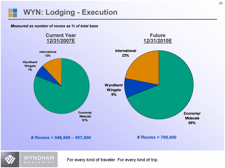 | Measured as number of rooms as % of total base Economy/ Midscale Wyndham/ Wingate International 0.81 0.07 0.12 Current Year 12/31/2007E Economy/ Midscale Wyndham/ Wingate International 0.69 0.09 0.22 Future 12/31/2010E # Rooms = 700,000 WYN: Lodging - Execution # Rooms = 546,500 - 557,000 |