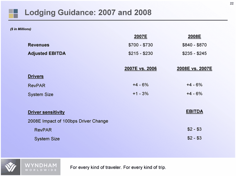 | Lodging Guidance: 2007 and 2008 2007E 2008E Revenues $700 - $730 $840 - $870 adjusted EBITDA $215 - $230 $235 - $245 2007E vs. 2006 2008E vs. 2007E Drivers RevPAR +4 - 6% +4 - 6% System Size +1 - 3% +4 - 6% Driver sensitivity EBITDA 2008E Impact of 100bps Driver Change RevPAR $2 - $3 System Size $2 - $3 ($ in Millions) |