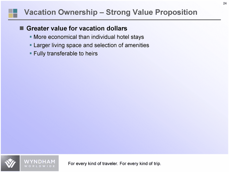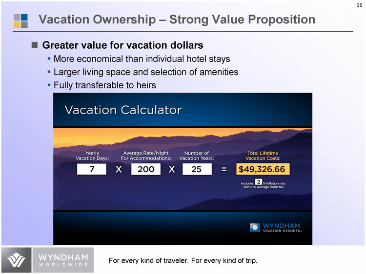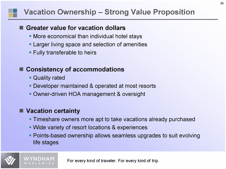 | Vacation Ownership - Strong Value Proposition Greater value for vacation dollars More economical than individual hotel stays Larger living space and selection of amenities Fully transferable to heirs |