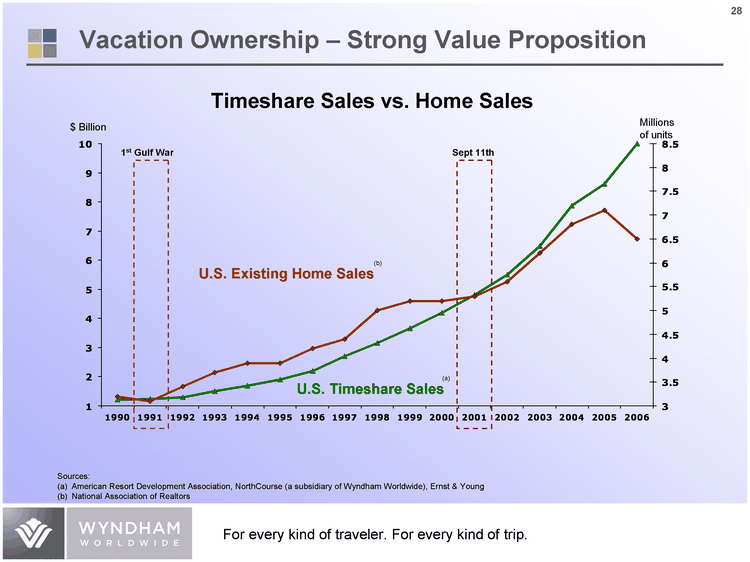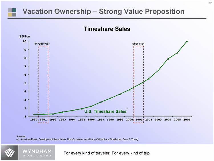 | Existing Home Sales U.S. Timeshare Sales 1990 3.2 1.2 1991 3.1 1.25 1992 3.4 1.3 1993 3.7 1.5 1994 3.9 1.7 1995 3.9 1.9 1996 4.2 2.2 1997 4.4 2.7 1998 5 3.15 1999 5.2 3.65 2000 5.2 4.2 2001 5.3 4.8 2002 5.6 5.5 2003 6.2 6.48 2004 6.8 7.87 2005 7.1 8.61 2006 6.5 10 Timeshare Sales vs. Home Sales Sources: (a) American Resort Development Association, NorthCourse (a subsidiary of Wyndham Worldwide), Ernst & Young (b) National Association of Realtors Sept 11th 1st Gulf War $ Billion Millions of units (b) U.S. Existing Home Sales (a) U.S. Timeshare Sales Vacation Ownership - Strong Value Proposition |