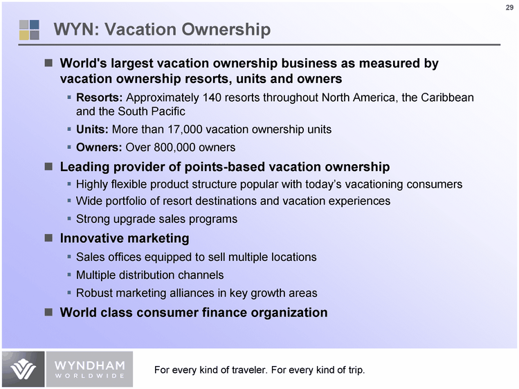 | WYN: Vacation Ownership World's largest vacation ownership business as measured by vacation ownership resorts, units and owners Resorts: Approximately 140 resorts throughout North America, the Caribbean and the South Pacific Units: More than 17,000 vacation ownership units Owners: Over 800,000 owners Leading provider of points-based vacation ownership Highly flexible product structure popular with today's vacationing consumers Wide portfolio of resort destinations and vacation experiences Strong upgrade sales programs Innovative marketing Sales offices equipped to sell multiple locations Multiple distribution channels Robust marketing alliances in key growth areas World class consumer finance organization |