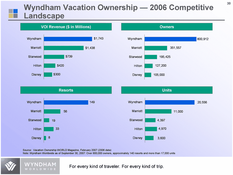 | Wyndham Vacation Ownership - 2006 Competitive Landscape VOI Stack 2 Stack 3 Stack 4 Stack 5 Stack 6 Stack 7 Stack 8 Totals (invisible) Stack 9 Stack 10 Stack 11 Stack 12 Stack 13 Stack 14 Stack 15 Stack 16 Wyndham 1743 20 90 Marriott 1438 20 80 Starwood 739 20 70 Hilton 420 20 60 Disney 300 VOI Revenue ($ in Millions) Units Stack 2 Stack 3 Stack 4 Stack 5 Stack 6 Stack 7 Stack 8 Totals (invisible) Stack 9 Stack 10 Stack 11 Stack 12 Stack 13 Stack 14 Stack 15 Stack 16 Wyndham 800912 20 90 Marriott 351557 20 80 Starwood 195425 20 70 Hilton 127200 20 60 Disney 105000 Owners Resorts Stack 2 Stack 3 Stack 4 Stack 5 Stack 6 Stack 7 Stack 8 Totals (invisible) Stack 9 Stack 10 Stack 11 Stack 12 Stack 13 Stack 14 Stack 15 Stack 16 Wyndham 149 20 90 Marriott 56 20 80 Starwood 19 20 70 Hilton 33 20 60 Disney 8 Resorts Units Stack 2 Stack 3 Stack 4 Stack 5 Stack 6 Stack 7 Stack 8 Totals (invisible) Stack 9 Stack 10 Stack 11 Stack 12 Stack 13 Stack 14 Stack 15 Stack 16 Wyndham 20556 20 90 Marriott 11000 20 80 Starwood 4397 20 70 Hilton 4970 20 60 Disney 3600 Units Source: Vacation Ownership WORLD Magazine, February 2007 (2006 data) Note: Wyndham Worldwide as of September 30, 2007: Over 800,000 owners, approximately 140 resorts and more than 17,000 units |