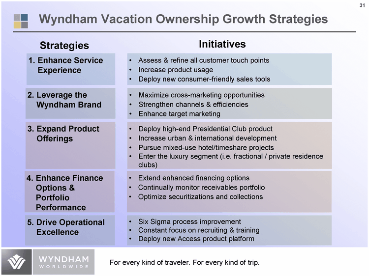 | Assess & refine all customer touch points Increase product usage Deploy new consumer-friendly sales tools Deploy high-end Presidential Club product Increase urban & international development Pursue mixed-use hotel/timeshare projects Enter the luxury segment (i.e. fractional / private residence clubs) Maximize cross-marketing opportunities Strengthen channels & efficiencies Enhance target marketing 1. Enhance Service Experience 3. Expand Product Offerings 2. Leverage the Wyndham Brand Strategies Initiatives Wyndham Vacation Ownership Growth Strategies Extend enhanced financing options Continually monitor receivables portfolio Optimize securitizations and collections 4. Enhance Finance Options & Portfolio Performance Six Sigma process improvement Constant focus on recruiting & training Deploy new Access product platform 5. Drive Operational Excellence |