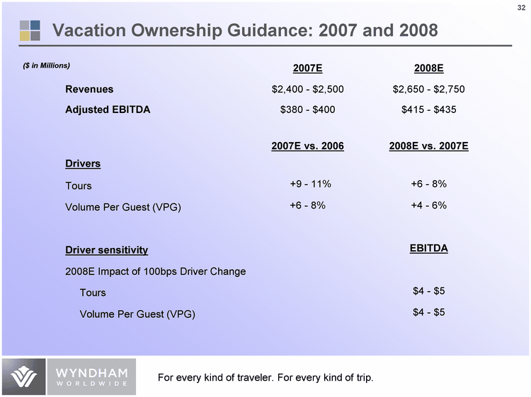 | Vacation Ownership Guidance: 2007 and 2008 ($ in Millions) 2007E 2008E Revenues $2,400 - $2,500 $2,650 - $2,750 adjusted EBITDA $380 - $400 $415 - $435 2007E vs. 2006 2008E vs. 2007E Drivers Tours +9 - 11% +6 - 8% Volume Per Guest (VPG) +6 - 8% +4 - 6% Driver sensitivity EBITDA 2008E Impact of 100bps Driver Change Tours $4 - $5 Volume Per Guest (VPG) $4 - $5 |