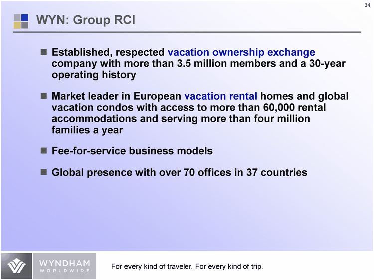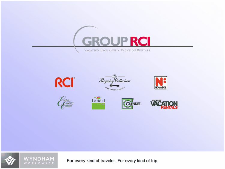 | WYN: Group RCI Established, respected vacation ownership exchange company with more than 3.5 million members and a 30-year operating history Market leader in European vacation rental homes and global vacation condos with access to more than 60,000 rental accommodations and serving more than four million families a year Fee-for-service business models Global presence with over 70 offices in 37 countries |