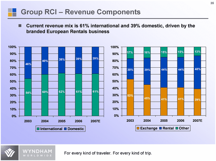 | Group RCI - Revenue Components Current revenue mix is 61% international and 39% domestic, driven by the branded European Rentals business 2003 2004 2005 2006 2007E International 0.54 0.6 0.62 0.61 0.61 Domestic 0.46 0.4 0.38 0.39 0.39 2003 2004 2005 2006 2007E Exchange 0.53 0.45 0.41 0.41 0.39 Rental 0.3 0.39 0.44 0.44 0.48 Other 0.17 0.16 0.15 0.15 0.13 46% 40% 38% 39% 39% 54% 60% 62% 61% 61% 53% 45% 41% 41% 39% 30% 39% 44% 44% 48% 17% 16% 15% 15% 13% |