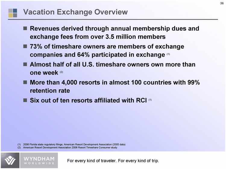 | Vacation Exchange Overview Revenues derived through annual membership dues and exchange fees from over 3.5 million members 73% of timeshare owners are members of exchange companies and 64% participated in exchange (1) Almost half of all U.S. timeshare owners own more than one week (2) More than 4,000 resorts in almost 100 countries with 99% retention rate Six out of ten resorts affiliated with RCI (1) 2006 Florida state regulatory filings; American Resort Development Association (2005 data) American Resort Development Association 2006 Resort Timeshare Consumer study |