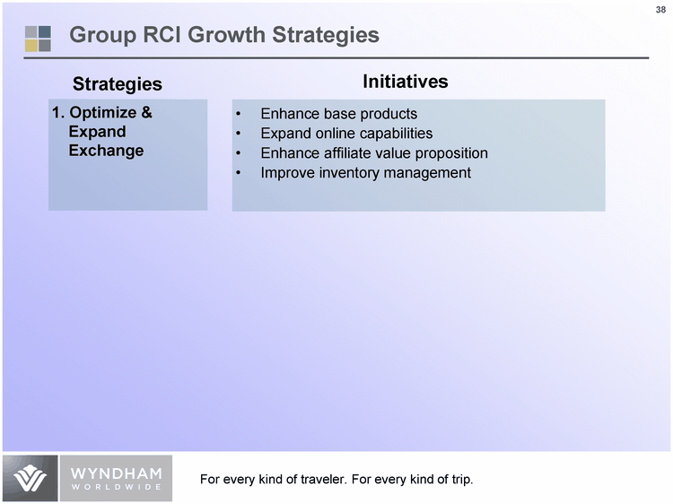 | Group RCI Growth Strategies Strategies Initiatives Enhance base products Expand online capabilities Enhance affiliate value proposition Improve inventory management 1. Optimize & Expand Exchange |