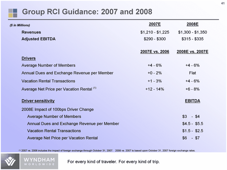 | Group RCI Guidance: 2007 and 2008 2007E 2008E Revenues $1,210 - $1,225 $1,300 - $1,350 adjusted EBITDA $290 - $300 $315 - $335 2007E vs. 2006 2008E vs. 2007E Drivers Average Number of Members +4 - 6% +4 - 6% Annual Dues and Exchange Revenue per Member +0 - 2% Flat Vacation Rental Transactions +1 - 3% +4 - 6% Average Net Price per Vacation Rental (1) +12 - 14% +6 - 8% Driver sensitivity EBITDA 2008E Impact of 100bps Driver Change 2008E Impact of 100bps Driver Change 2008E Impact of 100bps Driver Change Average Number of Members Average Number of Members $3 - $4 Annual Dues and Exchange Revenue per Member Annual Dues and Exchange Revenue per Member $4.5 - $5.5 Vacation Rental Transactions Vacation Rental Transactions $1.5 - $2.5 Average Net Price per Vacation Rental Average Net Price per Vacation Rental $6 - $7 ($ in Millions) (1) 2007 vs. 2006 includes the impact of foreign exchange through October 31, 2007. 2008 vs. 2007 is based upon October 31, 2007 foreign exchange rates. |