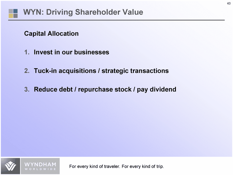 | WYN: Driving Shareholder Value Capital Allocation Invest in our businesses Tuck-in acquisitions / strategic transactions Reduce debt / repurchase stock / pay dividend |