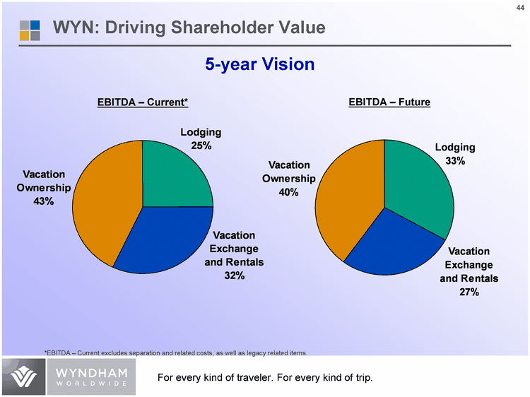 | Lodging 0.33 0.27 Vacation Exchange and Rentals 0.27 0.34 Vacation Ownership 0.4 0.39 EBITDA - Future 44 5-year Vision WYN: Driving Shareholder Value Lodging 0.25 0.27 Vacation Exchange and Rentals 0.32 0.34 Vacation Ownership 0.43 0.39 EBITDA - Current* *EBITDA - Current excludes separation and related costs, as well as legacy related items. |