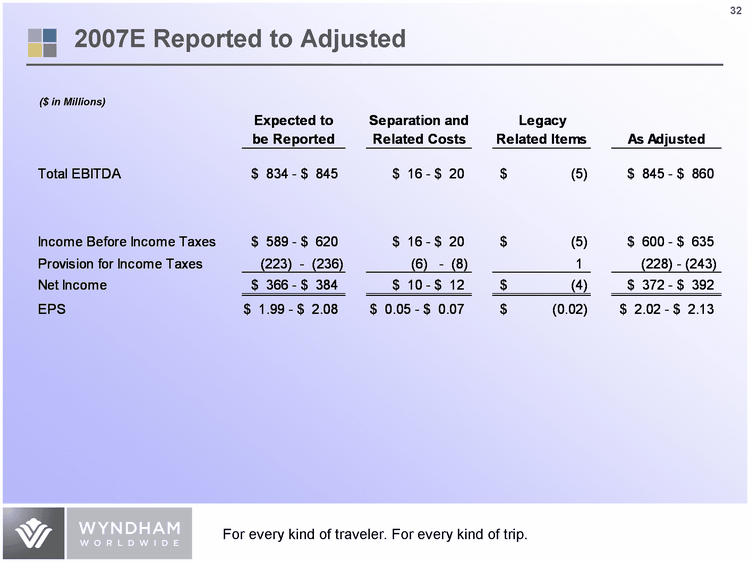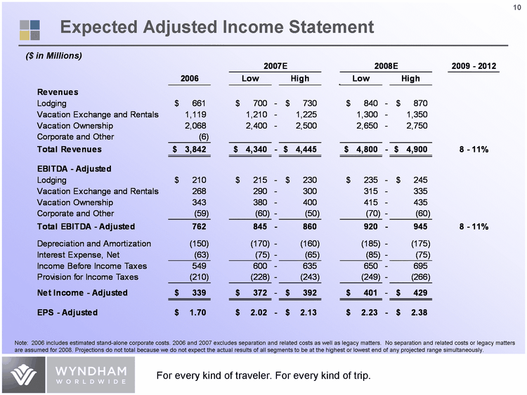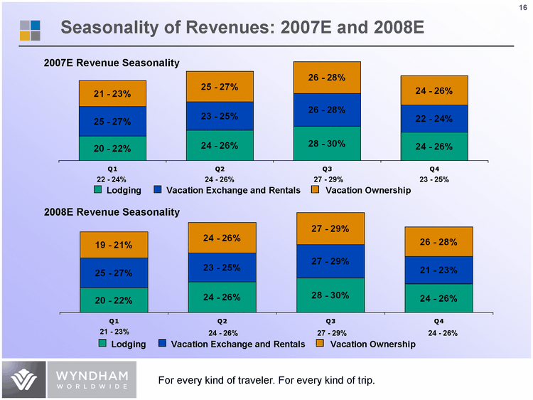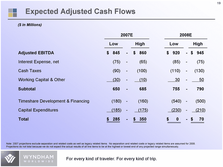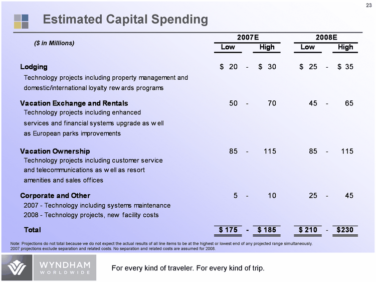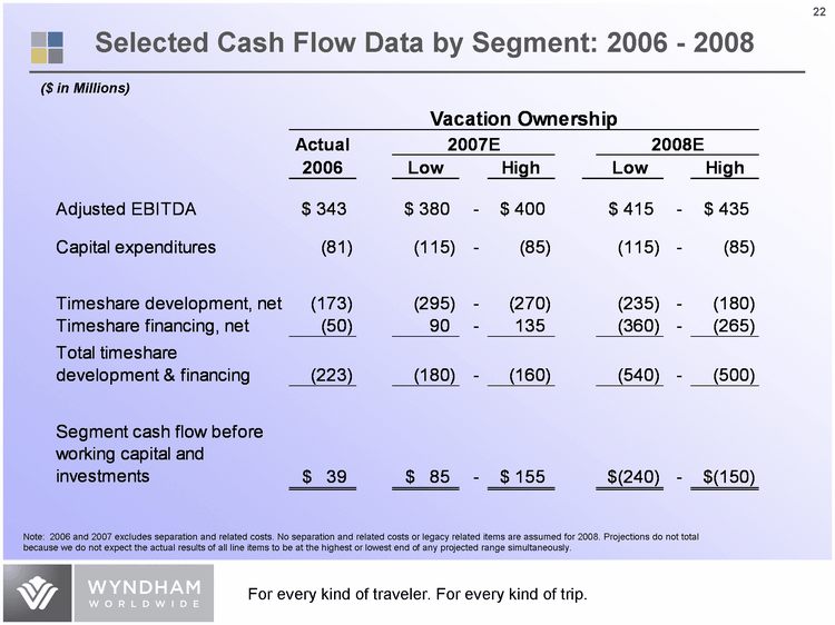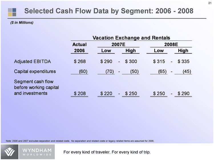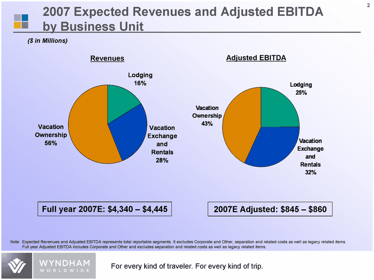 | 2007 Expected Revenues and Adjusted EBITDA by Business Unit Lodging 0.25 0.27 Vacation Exchange and Rentals 0.32 0.34 Vacation Ownership 0.43 0.39 Lodging 0.16 Vacation Exchange and Rentals 0.28 Vacation Ownership 0.56 Revenues Adjusted EBITDA ($ in Millions) Full year 2007E: $4,340 - $4,445 2007E Adjusted: $845 - $860 Note: Expected Revenues and Adjusted EBITDA represents total reportable segments. It excludes Corporate and Other, separation and related costs as well as legacy related items. Full year Adjusted EBITDA includes Corporate and Other and excludes separation and related costs as well as legacy related items. |