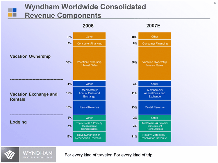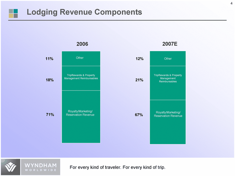 | 3 2007E 2006 Membership/ Transaction Revenue Other Consumer Financing Vacation Ownership Interest Sales Other Membership/ Annual Dues and Exchange Rental Revenue 8% 8% 38% 4% 12% 13% 2% 3% 12% Royalty/Marketing/ Reservation Revenue TripRewards & Property Management Reimbursables Other Membership/ Transaction Revenue Other Consumer Financing Vacation Ownership Interest Sales Other Membership/ Annual Dues and Exchange Rental Revenue 10% 8% 38% 4% 11% 13% 2% 3% 11% Royalty/Marketing/ Reservation Revenue TripRewards & Property Management Reimbursables Other Vacation Ownership - -------------------------------------- Vacation Exchange and Rentals - -------------------------------------- Lodging Wyndham Worldwide Consolidated Revenue Components |