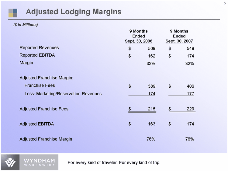 | 12% 21% 67% Royalty/Marketing/ Reservation Revenue TripRewards & Property Management Reimbursables Other 4 2007E 11% 18% 71% Royalty/Marketing/ Reservation Revenue TripRewards & Property Management Reimbursables Other 2006 Lodging Revenue Components |