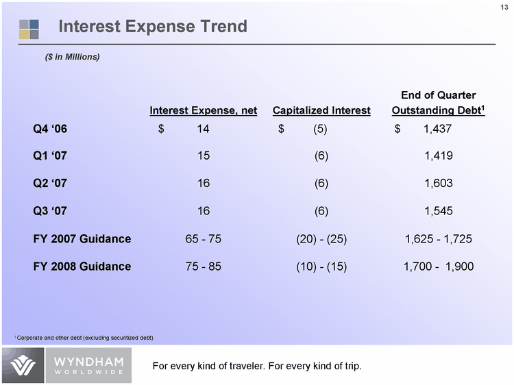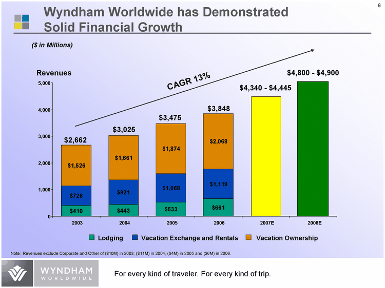 | Wyndham Worldwide has Demonstrated Solid Financial Growth ($ in Millions) Lodging Vacation Exchange and Rentals Vacation Ownership Note: Revenues exclude Corporate and Other of ($10M) in 2003, ($11M) in 2004, ($4M) in 2005 and ($6M) in 2006. Revenues $2,662 $3,025 $3,475 $3,848 $4,340 - $4,445 $4,800 - $4,900 $410 $443 $533 $661 $726 $921 $1,068 $1,119 $1,526 $1,661 $2,068 $1,874 0 1,000 2,000 3,000 4,000 5,000 2003 2004 2005 2006 2007E 2008E CAGR 13% |