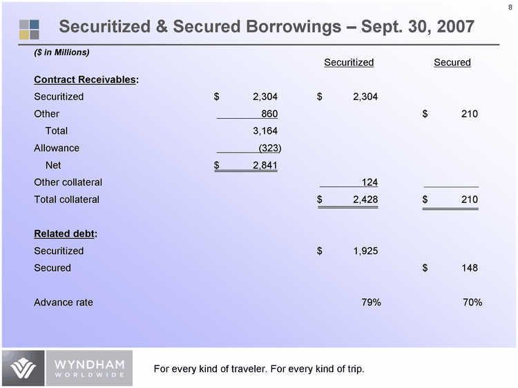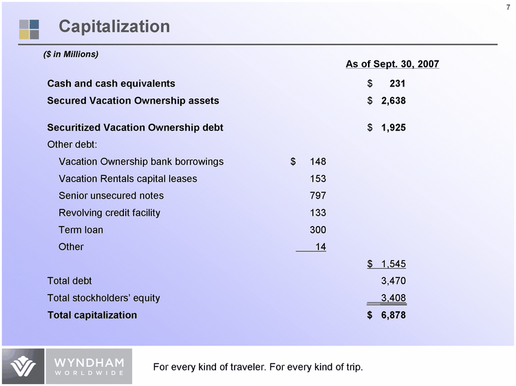 | ($ in Millions) As of Sept. 30, 2007 Cash and cash equivalents $ 231 Secured Vacation Ownership assets $ 2,638 Securitized Vacation Ownership debt $ 1,925 Other debt: Vacation Ownership bank borrowings $ 148 Vacation Rentals capital leases 153 Senior unsecured notes 797 Revolving credit facility 133 Term loan 300 Other 14 $ 1,545 Total debt 3,470 Total stockholders' equity 3,408 Total capitalization $ 6,878 Capitalization |