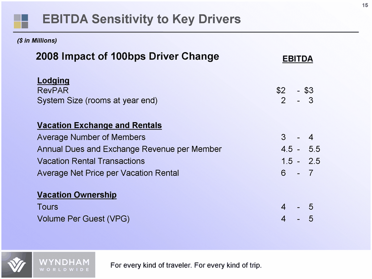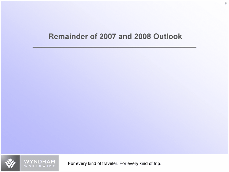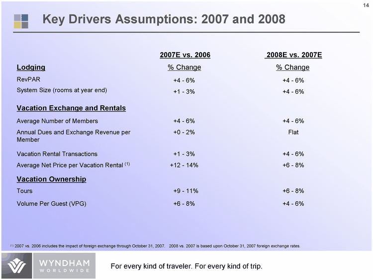 | 2007E vs. 2006 2007E vs. 2006 2008E vs. 2007E Lodging % Change % Change % Change RevPAR +4 - 6% +4 - 6% +4 - 6% System Size (rooms at year end) +1 - 3% +1 - 3% +4 - 6% Vacation Exchange and Rentals Average Number of Members +4 - 6% +4 - 6% +4 - 6% Annual Dues and Exchange Revenue per Member +0 - 2% +0 - 2% Flat Vacation Rental Transactions +1 - 3% +1 - 3% +4 - 6% Average Net Price per Vacation Rental (1) +12 - 14% +12 - 14% +6 - 8% Vacation Ownership Tours +9 - 11% +9 - 11% +6 - 8% Volume Per Guest (VPG) +6 - 8% +6 - 8% +4 - 6% (1) 2007 vs. 2006 includes the impact of foreign exchange through October 31, 2007. 2008 vs. 2007 is based upon October 31, 2007 foreign exchange rates. Key Drivers Assumptions: 2007 and 2008 |