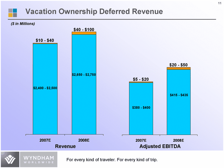 | 2007E 2008E 2007E 2008E 2450 2700 339 425 20 70 34.6 31.6 North 45.9 46.9 45 43.9 Vacation Ownership Deferred Revenue 2007E 2008E 2007E 2008E 2450 2700 339 425 West 30.6 38.6 7 15 North 45.9 46.9 45 43.9 $2,400 - $2,500 $40 - $100 $10 - $40 $380 - $400 $415 - $435 $20 - $50 $5 - $20 Revenue Adjusted EBITDA ($ in Millions) $2,650 - $2,750 |