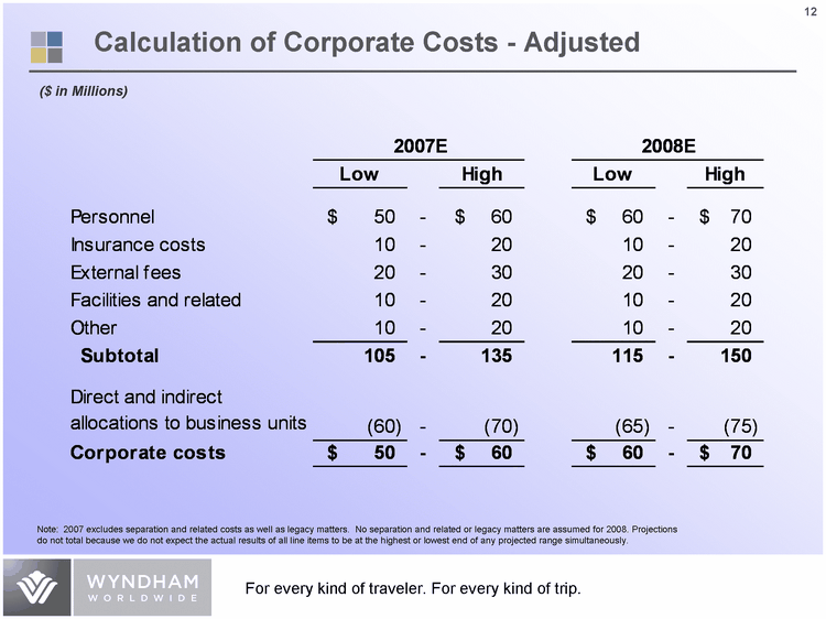| 12 Calculation of Corporate Costs - Adjusted ($ in Millions) Note: 2007 excludes separation and related costs as well as legacy matters. No separation and related or legacy matters are assumed for 2008. Projections do not total because we do not expect the actual results of all line items to be at the highest or lowest end of any projected range simultaneously. |