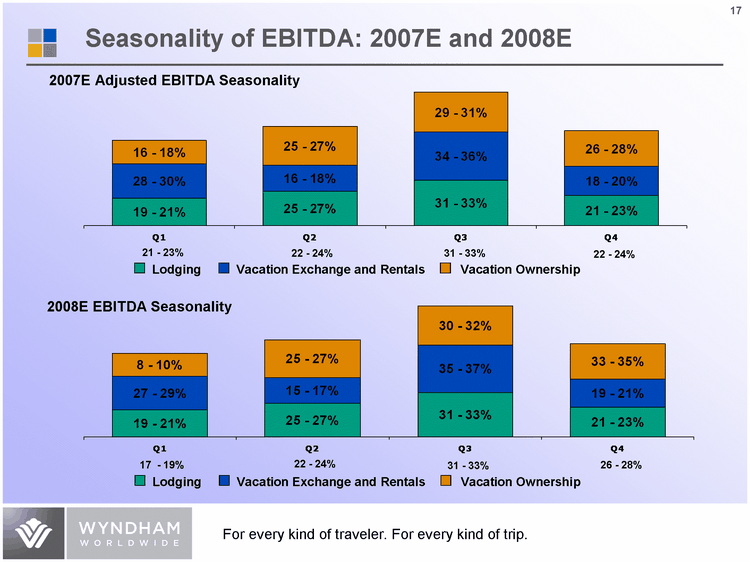 | Seasonality of Revenues: 2007E and 2008E 2007E Revenue Seasonality Lodging Vacation Exchange and Rentals Vacation Ownership 22 - 24% 24 - 26% 27 - 29% 23 - 25% 16 2008E Revenue Seasonality Lodging Vacation Exchange and Rentals Vacation Ownership 21 - 23% 24 - 26% 27 - 29% 24 - 26% Lodging VNG Timeshare Q1 0.21 0.25 0.22 Q2 0.26 0.24 0.26 Q3 0.29 0.28 0.27 Q4 0.24 0.23 0.25 Lodging VNG Timeshare Q1 0.21 0.25 0.22 Q2 0.26 0.24 0.26 Q3 0.29 0.28 0.27 Q4 0.24 0.23 0.25 |