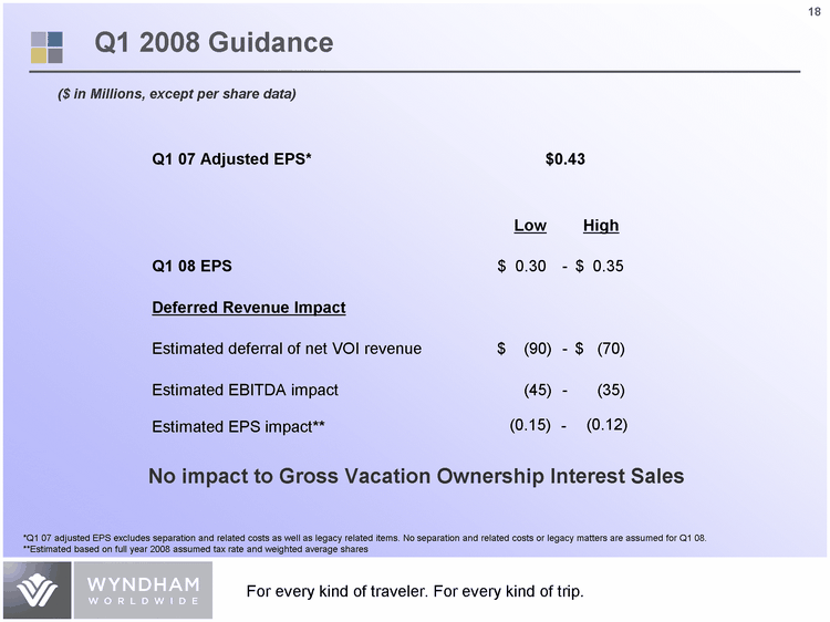 | 18 (45) - - (35) Estimated EBITDA impact $ (90) - - $ (70) Estimated deferral of net VOI revenue Deferred Revenue Impact $ 0.30 - - $ 0.35 Q1 08 EPS High Low $0.43 Q1 07 Adjusted EPS* Q1 2008 Guidance ($ in Millions, except per share data) No impact to Gross Vacation Ownership Interest Sales *Q1 07 adjusted EPS excludes separation and related costs as well as legacy related items. No separation and related costs or legacy matters are assumed for Q1 08. **Estimated based on full year 2008 assumed tax rate and weighted average shares (0.12) Estimated EPS impact** (0.15) - - |
