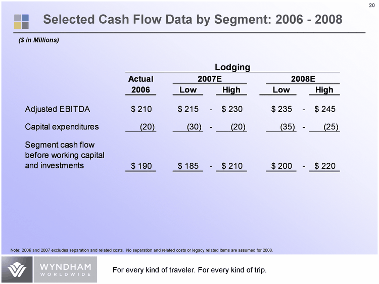 | Expected Adjusted Cash Flows ($ in Millions) Note: 2007 projections exclude separation and related costs as well as legacy related items. No separation and related costs or legacy related items are assumed for 2008. Projections do not total because we do not expect the actual results of all line items to be at the highest or lowest end of any projected range simultaneously. 2007E 2007E 2007E 2008E 2008E 2008E Low High Low High Adjusted EBITDA $ 845 - $ 860 $ 920 - $ 945 Interest Expense, net (75) - (65) (85) - (75) Cash Taxes (90) - (100) (110) - (130) Working Capital & Other (30) - (10) 30 - 50 Subtotal 650 - 685 755 - 790 Timeshare Development & Financing (180) - (160) (540) - (500) Capital Expenditures (185) - (175) (230) - (210) Total $ 285 - $ 350 $ 0 - $ 70 19 |