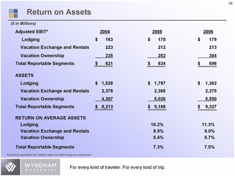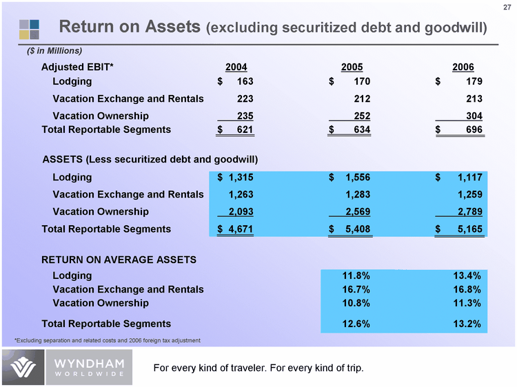 | Adjusted EBIT* 2004 2005 2006 Lodging $ 163 $ 170 $ 179 Vacation Exchange and Rentals 223 212 213 Vacation Ownership 235 252 304 Total Reportable Segments $ 621 $ 634 $ 696 Lodging $ 1,315 $ 1,556 $ 1,117 Vacation Exchange and Rentals 1,263 1,283 1,259 Vacation Ownership 2,093 2,569 2,789 Total Reportable Segments $ 4,671 $ 5,408 $ 5,165 RETURN ON AVERAGE ASSETS Lodging 11.8% 13.4% Vacation Exchange and Rentals 16.7% 16.8% Vacation Ownership 10.8% 11.3% Total Reportable Segments 12.6% 13.2% *Excluding separation and related costs and 2006 foreign tax adjustment ASSETS (Less securitized debt and goodwill) ($ in Millions) Return on Assets (excluding securitized debt and goodwill) |