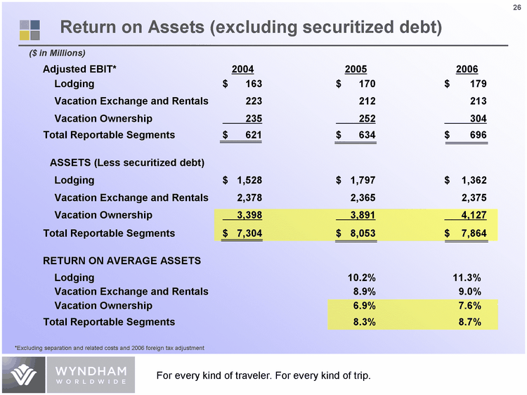 | 25 Adjusted EBIT* 2004 2005 2006 Lodging $ 163 $ 170 $ 179 Vacation Exchange and Rentals 223 212 213 Vacation Ownership 235 252 304 Total Reportable Segments $ 621 $ 634 $ 696 ASSETS Lodging $ 1,528 $ 1,797 $ 1,362 Vacation Exchange and Rentals 2,378 2,365 2,375 Vacation Ownership 4,307 5,026 5,590 Total Reportable Segments $ 8,213 $ 9,188 $ 9,327 RETURN ON AVERAGE ASSETS Lodging 10.2% 11.3% Vacation Exchange and Rentals 8.9% 9.0% Vacation Ownership 5.4% 5.7% Total Reportable Segments 7.3% 7.5% *Excluding separation and related costs and 2006 foreign tax adjustment ($ in Millions) Return on Assets |