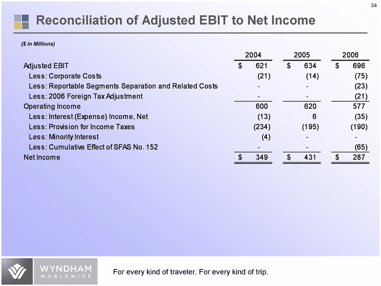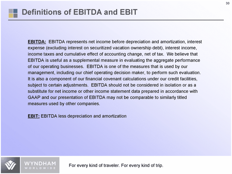 | Definitions of EBITDA and EBIT EBITDA: EBITDA represents net income before depreciation and amortization, interest expense (excluding interest on securitized vacation ownership debt), interest income, income taxes and cumulative effect of accounting change, net of tax. We believe that EBITDA is useful as a supplemental measure in evaluating the aggregate performance of our operating businesses. EBITDA is one of the measures that is used by our management, including our chief operating decision maker, to perform such evaluation. It is also a component of our financial covenant calculations under our credit facilities, subject to certain adjustments. EBITDA should not be considered in isolation or as a substitute for net income or other income statement data prepared in accordance with GAAP and our presentation of EBITDA may not be comparable to similarly titled measures used by other companies. EBIT: EBITDA less depreciation and amortization |