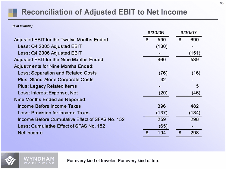| Return on Invested Capital ($ in Millions) 9/30/05 9/30/06 9/30/07 Debt, excluding securitized debt $ 1,164* $ 1,164 $ 1,545 Equity 3,612* 3,612 3,408 Adjustments: Adjusted net income Q1 - Q3 2006 (254) - - Adjusted net income Q4 2005 (76) - - Adjusted capitalization 4,446* 4,776 4,953 Cash (100) (160) (231) Adjusted net capitalization $ 4,346 $ 4,616 $ 4,722 Average capital employed Adjusted EBIT for the 12 months ended 9/30/06 and 9/30/07 $ 4,481 $ 590 $ 4,669 $ 690 ROIC 13.2% 14.8% *Estimated net capitalization as if Wyndham Worldwide was a stand alone company at 9/30/05. |