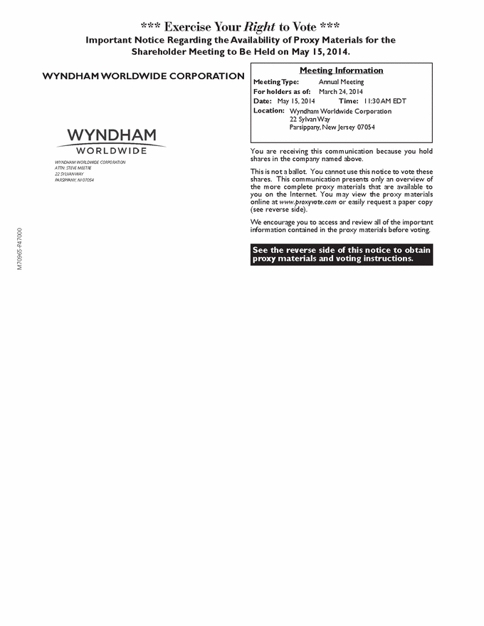 M70965-P47000 You are receiving this communication because you hold shares in the company named above. This is not a ballot. You cannot use this notice to vote these shares. This communication presents only an overview of the more complete proxy materials that are available to you on the Internet. You may view the proxy materials online at www.proxyvote.com or easily request a paper copy (see reverse side). We encourage you to access and review all of the important information contained in the proxy materials before voting. WYNDHAM WORLDWIDE CORPORATION *** Exercise Your Right to Vote *** Important Notice Regarding the Availability of Proxy Materials for the Shareholder Meeting to Be Held on May 15, 2014. WYNDHAM WORLDWIDE CORPORATION ATTN: STEVE MEETRE 22 SYLVAN WAY PARSIPPANY, NJ 07054 Meeting Information Meeting Type: Annual Meeting For holders as of: March 24, 2014 Date: May 15, 2014 Time: 11:30 AM EDT Location: Wyndham Worldwide Corporation 22 Sylvan Way Parsippany, New Jersey 07054 See the reverse side of this notice to obtain proxy materials and voting instructions. |