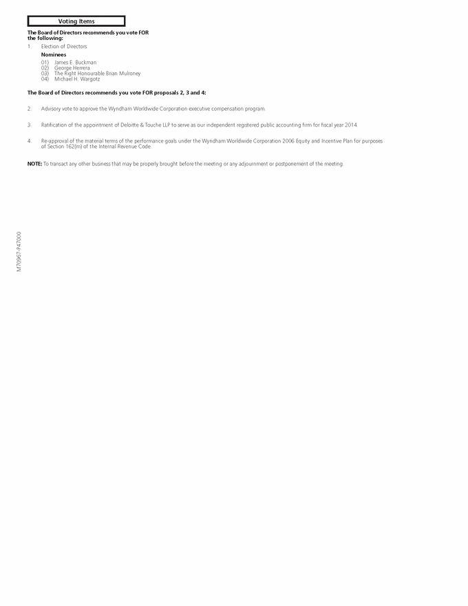 Voting Items M70967-P47000 2. Advisory vote to approve the Wyndham Worldwide Corporation executive compensation program. 3. Ratification of the appointment of Deloitte & Touche LLP to serve as our independent registered public accounting firm for fiscal year 2014. 4. Re-approval of the material terms of the performance goals under the Wyndham Worldwide Corporation 2006 Equity and Incentive Plan for purposes of Section 162(m) of the Internal Revenue Code. NOTE: To transact any other business that may be properly brought before the meeting or any adjournment or postponement of the meeting. 01) James E. Buckman 02) George Herrera 03) The Right Honourable Brian Mulroney 04) Michael H. Wargotz 1. Election of Directors Nominees The Board of Directors recommends you vote FOR the following: The Board of Directors recommends you vote FOR proposals 2, 3 and 4: |
